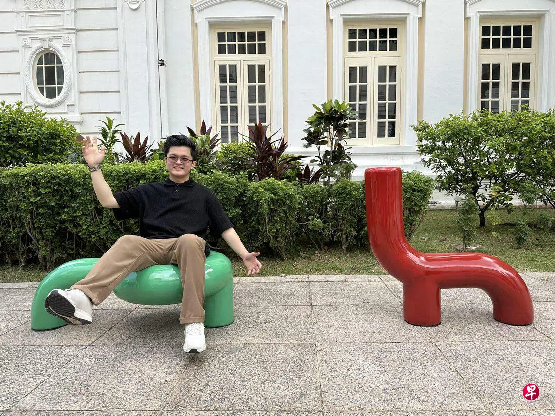 赖文凱示范了用玻璃纤维制成的长凳各种好玩的坐法,绿色凳子有凹下部分像游泳圈,坐下有塌陷感,红色凳子可以悬垂、倚靠、背靠、跨坐、拥抱它。他是南洋艺术学院校友,与南艺特别项目组的六名学生在工作坊共同完成作品。