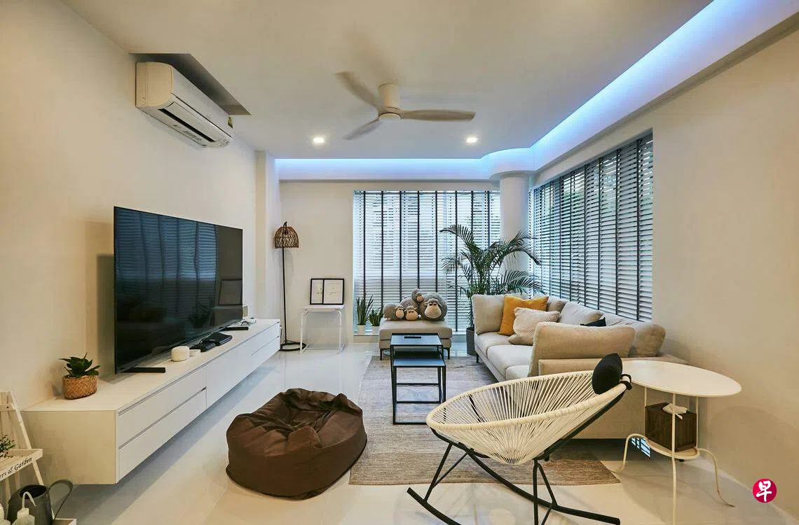 尽管屋主一个人住,她希望客厅有舒适的空间招待亲友,因此选择了比较大型的沙发,搭配具有趣味的摇摇椅和懒人豆袋椅。客厅的白色主题,从天花板、风扇、地砖、摇摇椅、百叶窗、电视架到小桌子,营造宽敞的空间。由于白色主题设计较简约,因此需要小饰品来点缀,比如桌子上的黑框摆设,椅子上的绒毛玩具,沙发上的坐垫,还有地上褐色的豆袋椅。