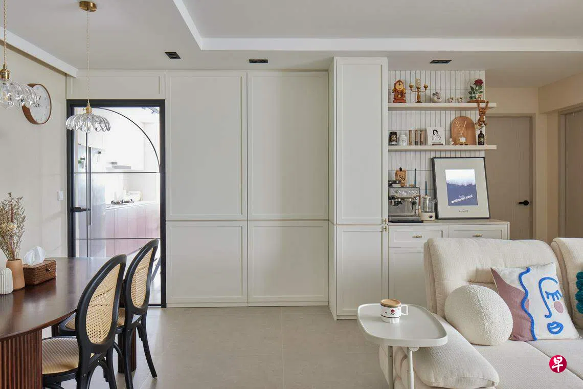 比如说,这个家用了许多半弧形状,包括玄关入口的半圆形砖,电视墙的半圆石膏板,还有主卧电视墙和天花板的设计等,这些特别的设计都要在有限预算中实现。陈柔冰说:“毕竟我们都是设计师,对家的要求更苛刻。我们在中国电商平台上淘了很多软装家具,比如餐桌椅、矮凳、摇椅、挂画、窗帘等,甚至门都是淘回来的,很多物品都要在网上寻找价钱合理的师傅来安装。”