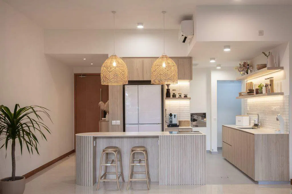 这个兀兰的五房式组屋单位,展示了奶油风的柔美特色,屋主是一对30多岁夫妻。负责室内设计的Twothree Design设计师卓采薇说,这个家的奶油风特色是以浅米色为主,风格走简约和干净路线,并恰当地搭配一点木色和灰色。