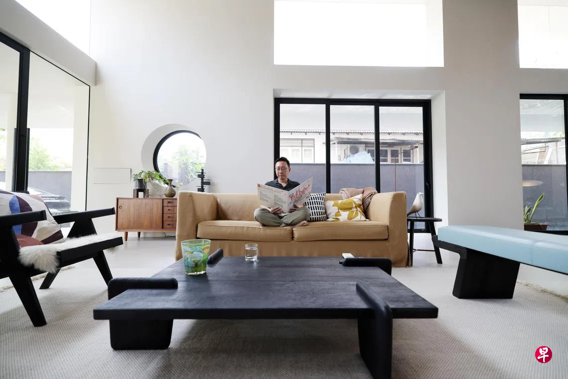 心仪独特设计的陈明辉,在家居风格微妙融入新加坡传统建筑元素。他说:“我不想要任何地方都有的典型设计。我很喜欢融合新与旧的设计,因此请负责室内设计的Monocot Studio创办人郑永强,融入本地传统建筑的元素。他从中峇鲁旧建筑中寻获灵感,那些建筑有长走廊、圆形窗户和弧形外观。我们在地面层使用水磨石(terrazzo)作为地板,那是一种组屋经常使用的旧材料;也特地融入一些绿色植物,包括(屋子)前面穿过门廊的树,还有后面的柳树。”他在2022年入住。
