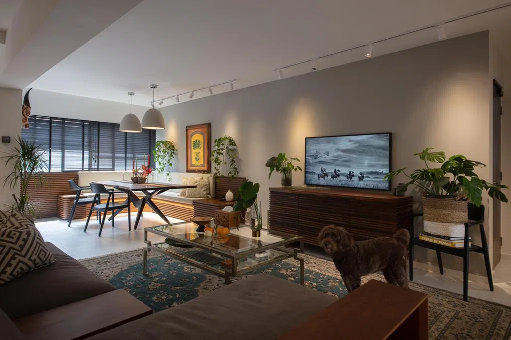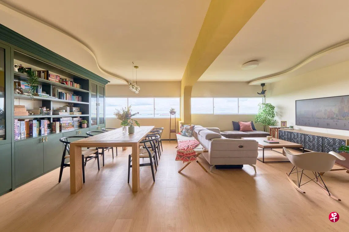 这个位于马林通道(Marine Drive)的五房式组屋享有漂亮海景,因此家居设计巧妙地将大海融入其中,海浪曲线成为贯穿天花板的设计特点,为鲜艳活泼风格的家居增添一抹浪花,展现海浪之柔美。