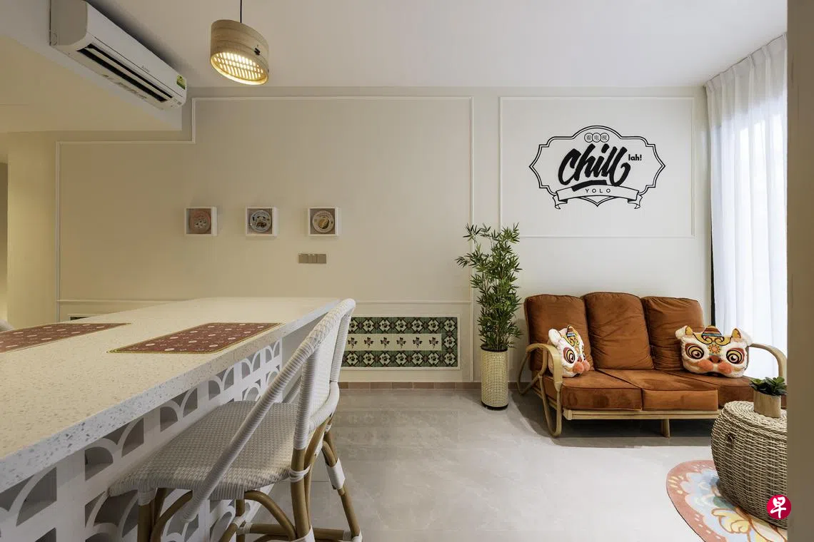 负责这个单位室内设计的Wolf Woof室内设计公司设计总监陈丽芬说,她从屋主提出的“新加坡风格”着手,进一步了解讨论后,为他们打造了现代土生华人风家居,并融入本事美食的趣味元素。