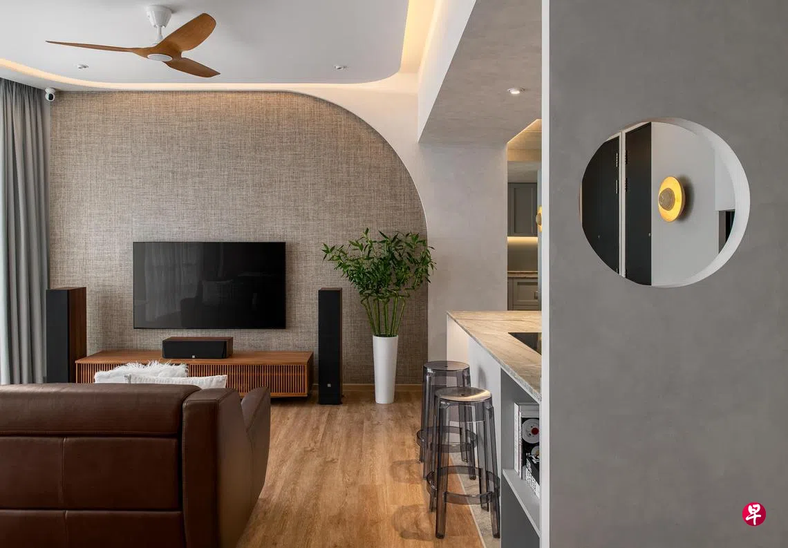负责这家室内设计的KNQ Associates室内设计公司创办人之一谭迪权说,由于这个单位的建筑结构有不少弧形,室内不像一般四四方方的格局那么容易设计规划,因此顺势强调其弧形的特点,让客厅天花板和墙壁的圆弧形设计成为视觉焦点。设计师也运用当代风格的特点,融入混搭的风格,搭配不同材质,还有不同的颜色混搭,为家居塑造一个充满悠闲舒适的优雅环境。