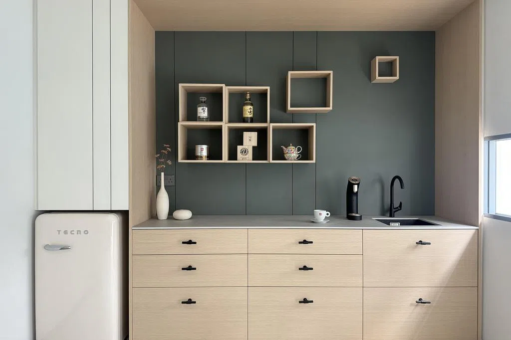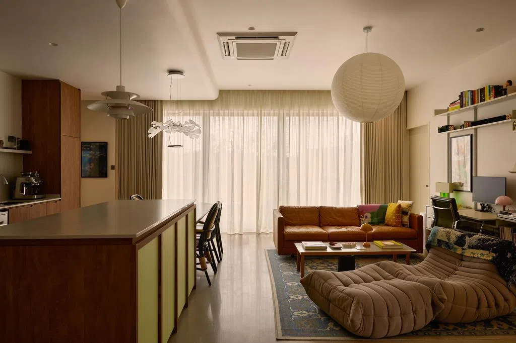 工业风并非只能冰冷刚硬,这个位于裕廊的五房式转售组屋单位,在室内设计公司Notion Of W(notionow.com)资深设计师蔡菁涵的构思下,呈现趣味的工业气质。赤裸的红砖墙面,粗犷水泥横梁上的手印,以及温润木色门柜与家具作为点缀,都流露出俏皮与温度。
