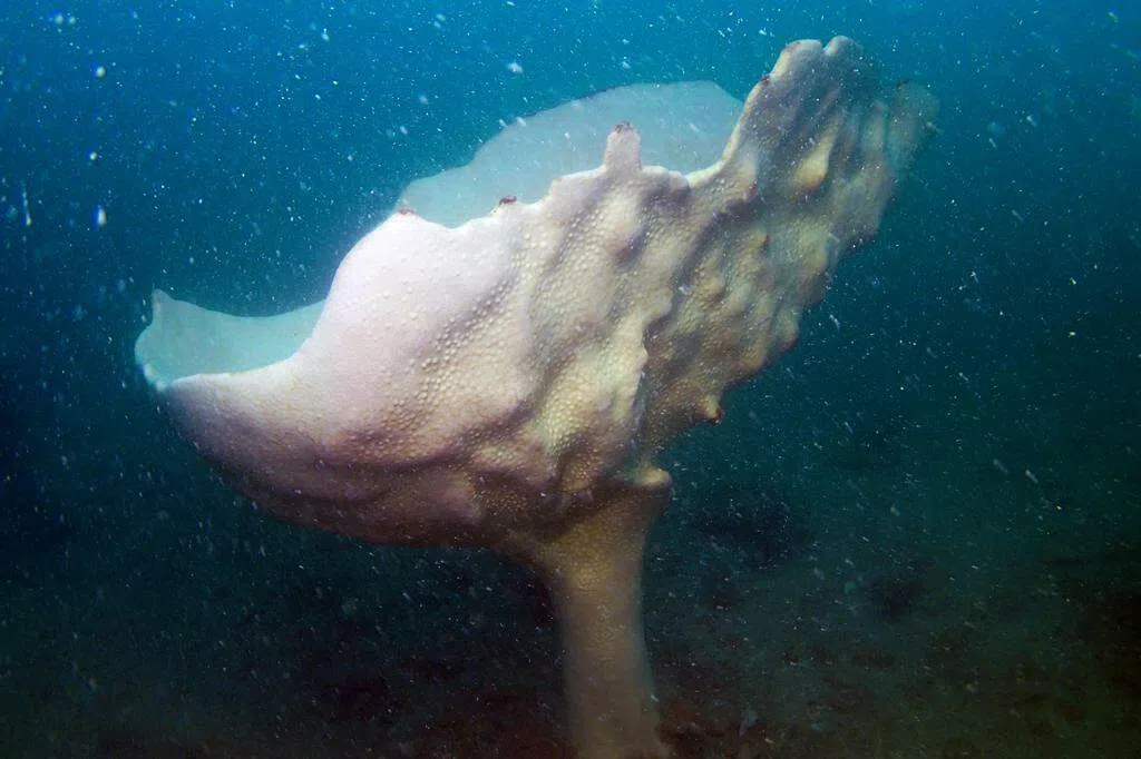 从上方观察巨蚌,会看见壳中伸出有皱褶的软组织,点缀以条纹和斑点,像花朵一样。