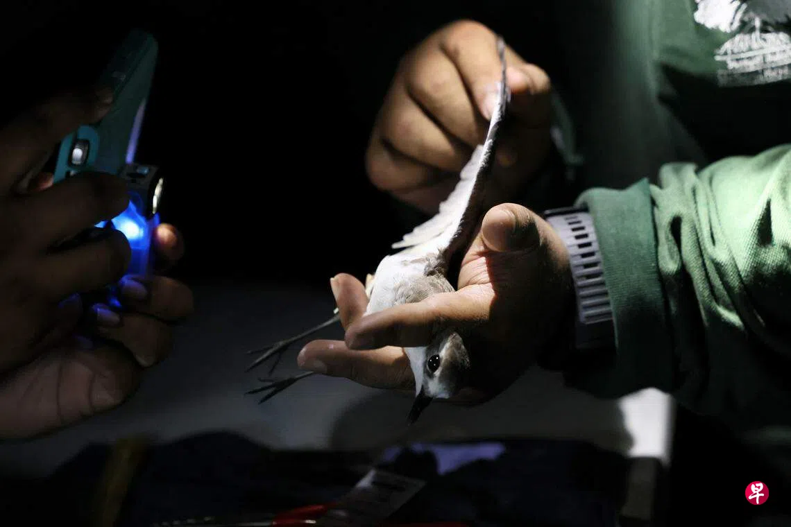 这是考耐性的工作,一个晚上可能一只鸟都抓不到,当然也有“丰收季”,让人一夜忙个不停。记者随队的那晚,四小时只抓到一只蒙古沙鸻和一只蝙蝠。公园局人员放走蝙蝠,再把蒙古沙鸻带到一旁的小木屋,检查它的健康,记录它的大小,之后为它上环,最后由经验丰富的国家公园局自然保护处(双溪布洛湿地保护区)高级经理李作为,给鸟儿佩戴追踪器。