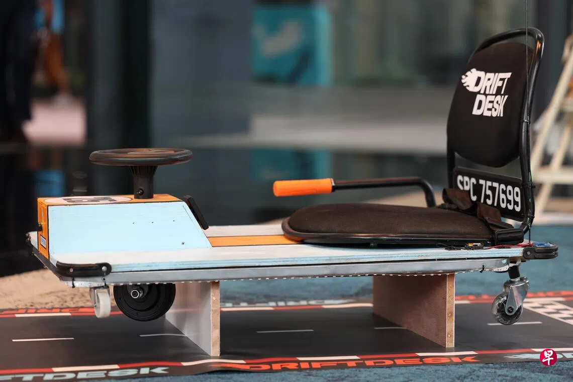 对赛车感兴趣的Jazil利用家人的三件旧家具,完成了这个让人变身赛车手的椅子:母亲的办公椅、爸爸的手推车,以及弟弟的玩具卡丁车(drift kart),漂亮的视觉设计让这台“漂移桌”特别抢眼。