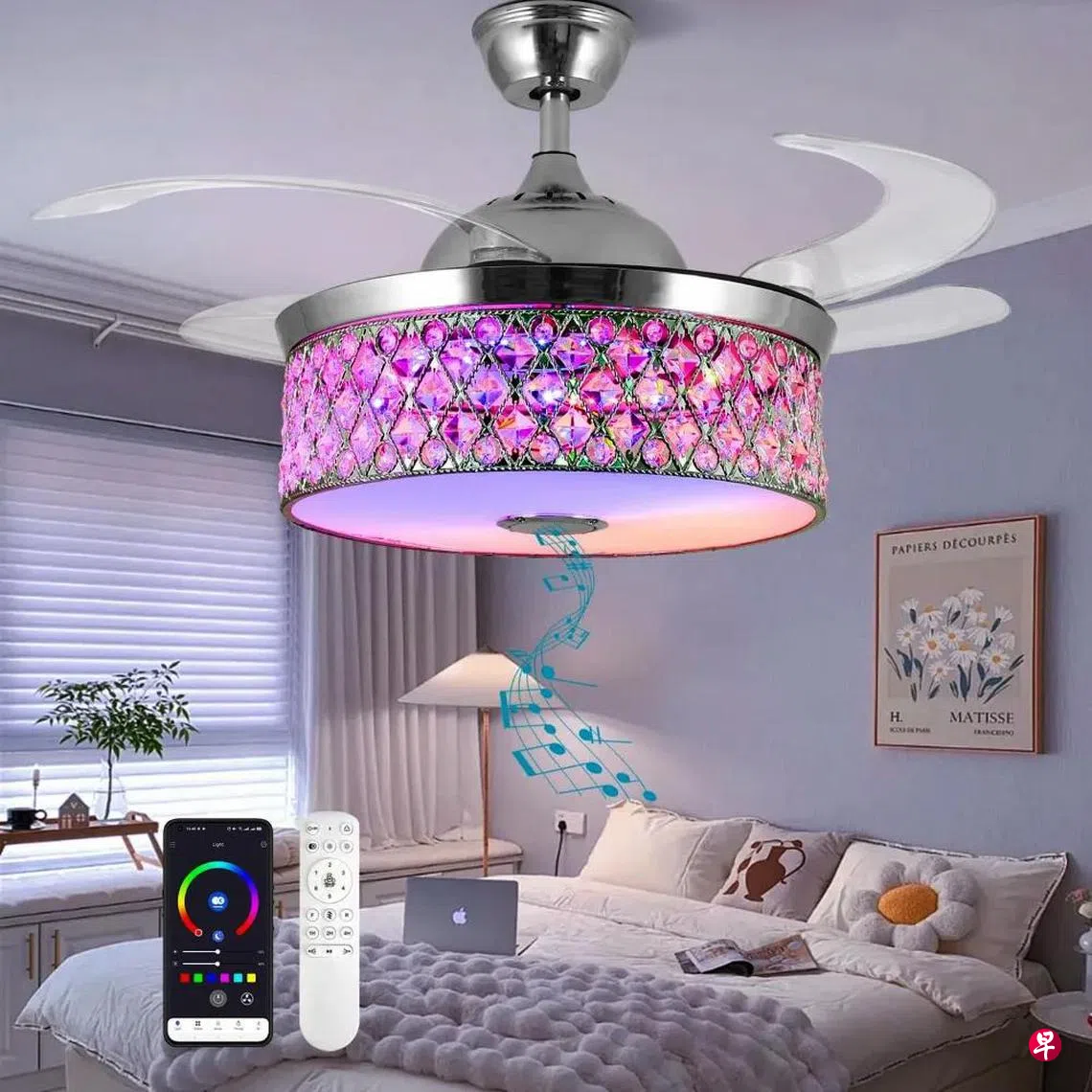 Dutrieux四个加厚亚克力透明可伸缩式扇叶蓝牙吊扇,附设蓝牙扬声器,提供3D立体环绕音乐,音质好。适合安置在卧房,播放轻音乐,放松身心。安装在儿童房里,听音乐讲故事,陪伴孩子入梦乡。通过应用遥控,扬声器和LED可独立操作。