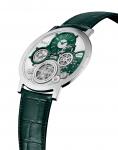 伯爵Altiplano至臻超薄系列Ultimate Concept腕表包括表壳和蓝宝石水晶底盖在内的整体厚度仅为2毫米,腕表凝聚了多项创新,包括与机芯一体成形的表壳,一体式上链表冠和超薄表镜。发条盒与动力调节装置也采用全新机制。Ultimate Concept腕表的构想是打造一款非多层结构的腕表,重新调整零部件尺寸,做从未尝试过的融合,并将表壳与机芯结合在一起构成一个整体。为了实现这个构想,伯爵开启了一段微型制表工艺之旅,申请了多达五项专利,成功研制出这款2毫米的手动上链腕表,其机芯齿轮的厚度仅为0.12毫米,蓝宝石表镜厚度更降至令人难以置信的0.2毫米。当然,最值得一提的是,为致敬腕表工坊的发源地瑞士的仙子坡(La Cote-aux-Fees),这款腕表的表桥、螺丝、指针和表盘均为墨绿色。