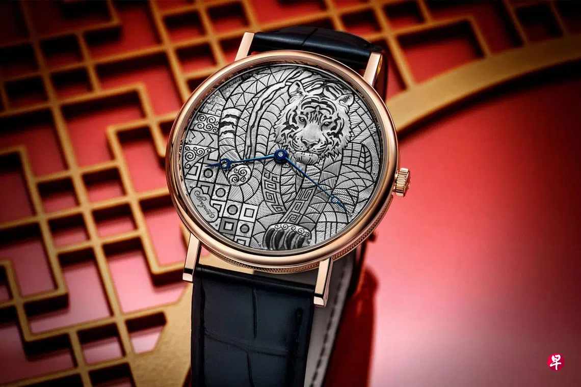 宝玑的这款虎年生肖腕表Classique 7145由玫瑰金和雕刻工艺混搭,表盘上刻画了一只生动的老虎。其表盘有三个制造过程,首先在金质表盘上雕刻出虎头造型,包括双眼、毛发及神态。画面背景和老虎身躯由数十个不规则的几何元素构成,然后是虎爪和尾巴部分融入了祥云纹、回字纹等中国传统纹样。为增加表盘的阴影与深度,雕刻工匠对雕槽做了黑化处理,空白部分添加了手工雕刻的玑镂纹饰,表盘工艺高超。这款40毫米腕表搭载Calibre 502.3自动上链超薄机芯,采用镂空发条盒及偏心式摆陀结构,动力储备45小时,限量生产八枚。