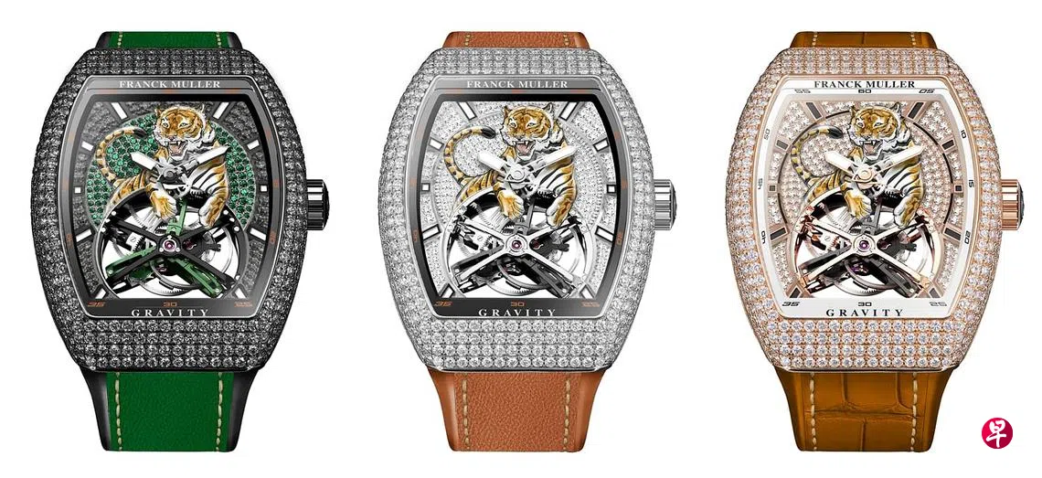 法穆兰配合虎年推出生肖腕表,将高级制表工艺与宝石镶嵌、微型雕刻和绘画等艺术工艺相结合的Vanguard Gravity Tiger,表盘上有一只栩栩如生的老虎跃过陀飞轮框架,非常吸睛。表盘上的老虎雕塑完全由品牌在Les Bois的制造厂内部制作。微型雕刻大师制作了这只活灵活现的虎,将其敲在一块薄薄的黄铜上,然后对雕塑进行喷砂处理以使表面光滑,再逐层手绘漆,创造出精确的颜色深浅。该款腕表有三种款式,18K玫瑰金或白金,表盘和表壳共镶嵌643颗圆形明亮式切割钻石;或采用黑色PVD涂层的18K白金表壳,表壳镶嵌465颗圆形明亮式切割黑色钻石,表盘上镶嵌63颗绿色钻石和48颗圆形明亮式切割黑色钻石。