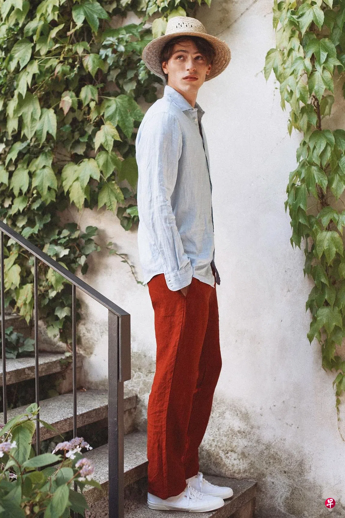 西装裤亦同此理,当然一整套酒红色或棕红色西装很显风范,不过单穿西装裤也未尝不可。红色系西装裤,上半身应尽量搭比裤装本身浅一个或几个色度的红色衣衫,白色、米色、黑色、淡蓝色的上装也很合宜。