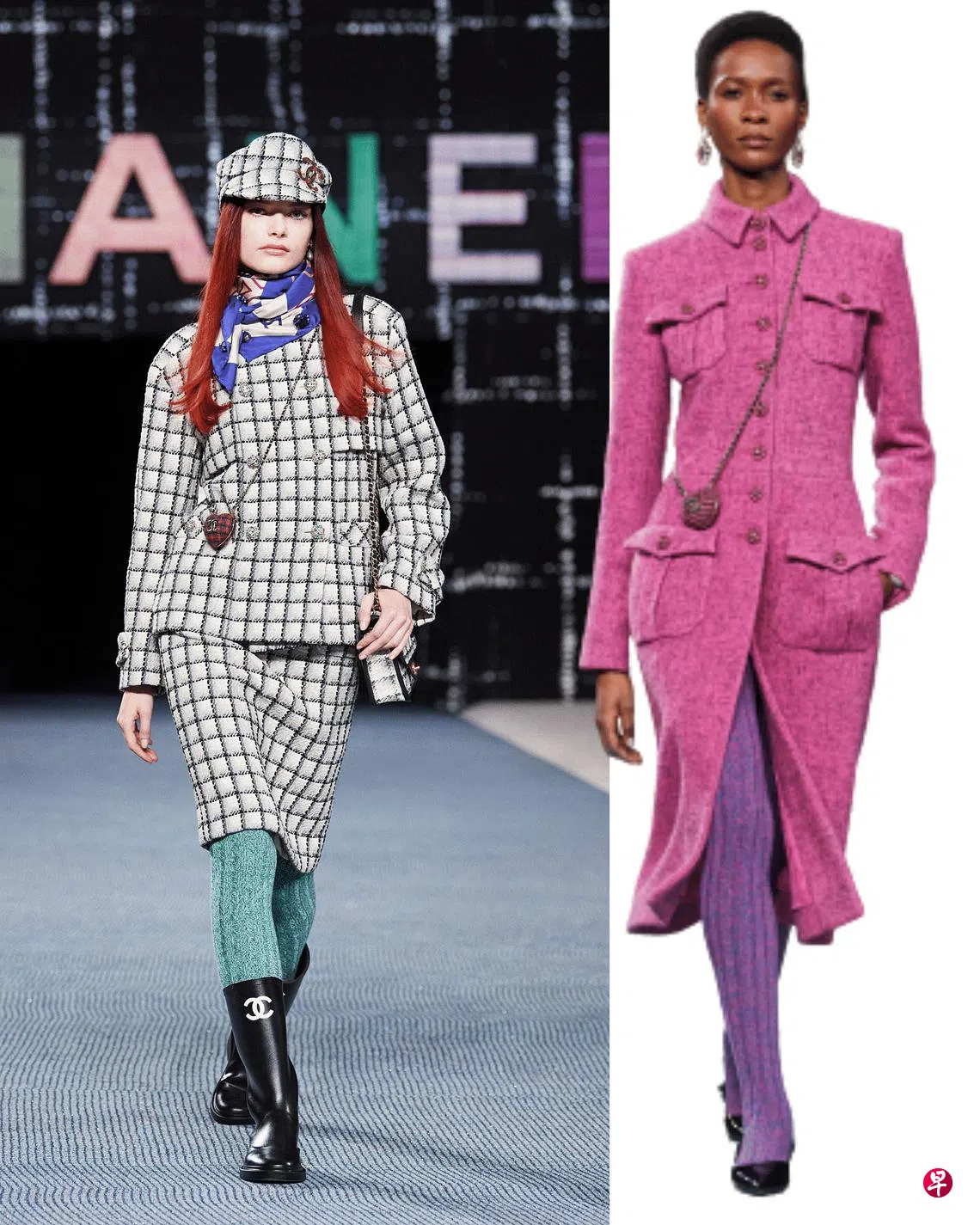 花呢,是法国品牌香奈儿(Chanel)最具代表性的材质。时尚艺术总监Virginie Viard用2022年秋冬秀和系列来致敬这款针织布料。从秀场背景、T台、座椅、邀请函到系列的大部分服饰,都以各色及各式织纹的花呢呈现。