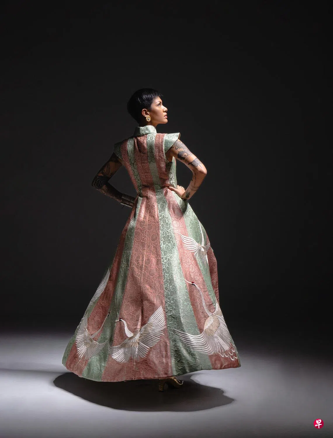 这些嫁衣大胆自信地混搭在本地购买的印族纱丽、华人织锦与印尼织锦(songket),女设计师使出裁剪魔法,变出既有旗袍,又有纱丽和马来套装(baju kurung)的层次感。胡瑞娴说:“我向来喜欢尝试不同的布料,但这次我逼自己更大胆地跨越到不同种族的领域,尝试不同的服装轮廓。很多顾客带着僵化的概念来找我们裁嫁衣,我希望透过这个系列开拓他们的思维,让他们看见糅合不同文化元素所给人的惊艳。选用粉色是要吸引年轻一代,让她们觉得民族元素很可亲,与她们的世界并不违和。”