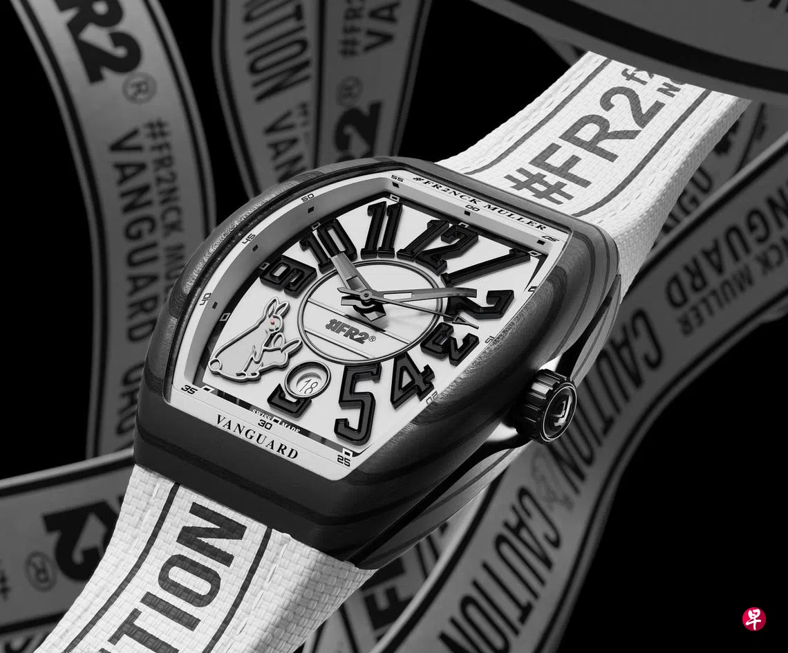 著名的酒桶形状大数字表盘当中,两者融合出这款以黑白色调为基础的前卫时尚作品。表盘7点钟方向取代数字的是#FR2 Fxxking Rabbit兔子图案,兔子的红眼睛成了表盘上的唯一颜色点缀。黑暗中Super-Luminova涂层方形表针和兔子图形清晰可见。#FR2NCK Muller Vanguard只在东南亚及澳大利亚地区限量发售800枚。