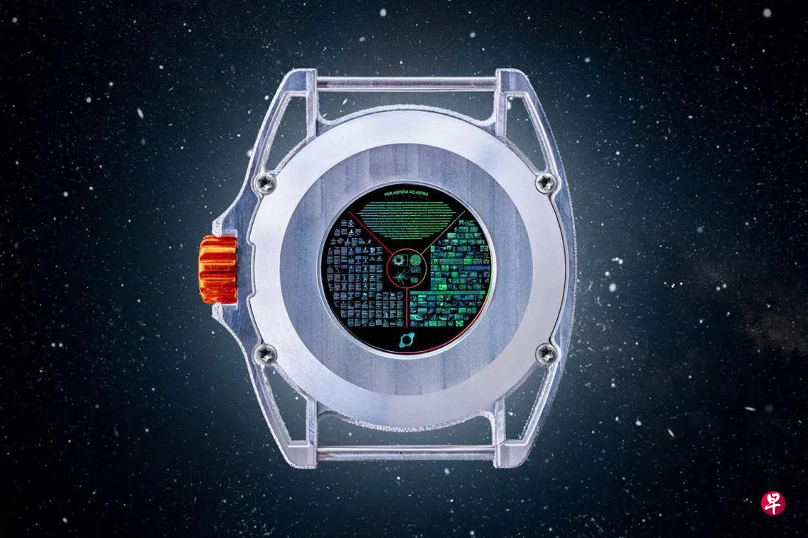 该表背的表壳带有一块镍合金板,这是一种由模拟物理存储介质打造的记忆盘,盘上有多达1000页的微雕刻,类似时间胶囊。