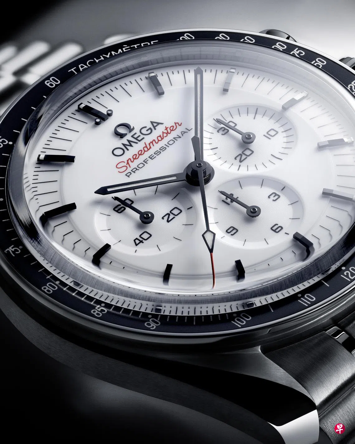 这款42毫米月球表为精钢材质,白色“阶梯式”表盘上饰有时间刻度,搭配月球表风格指针,黑色阳极氧化铝质表圈之上饰有著名的“Dot over 90”标记。