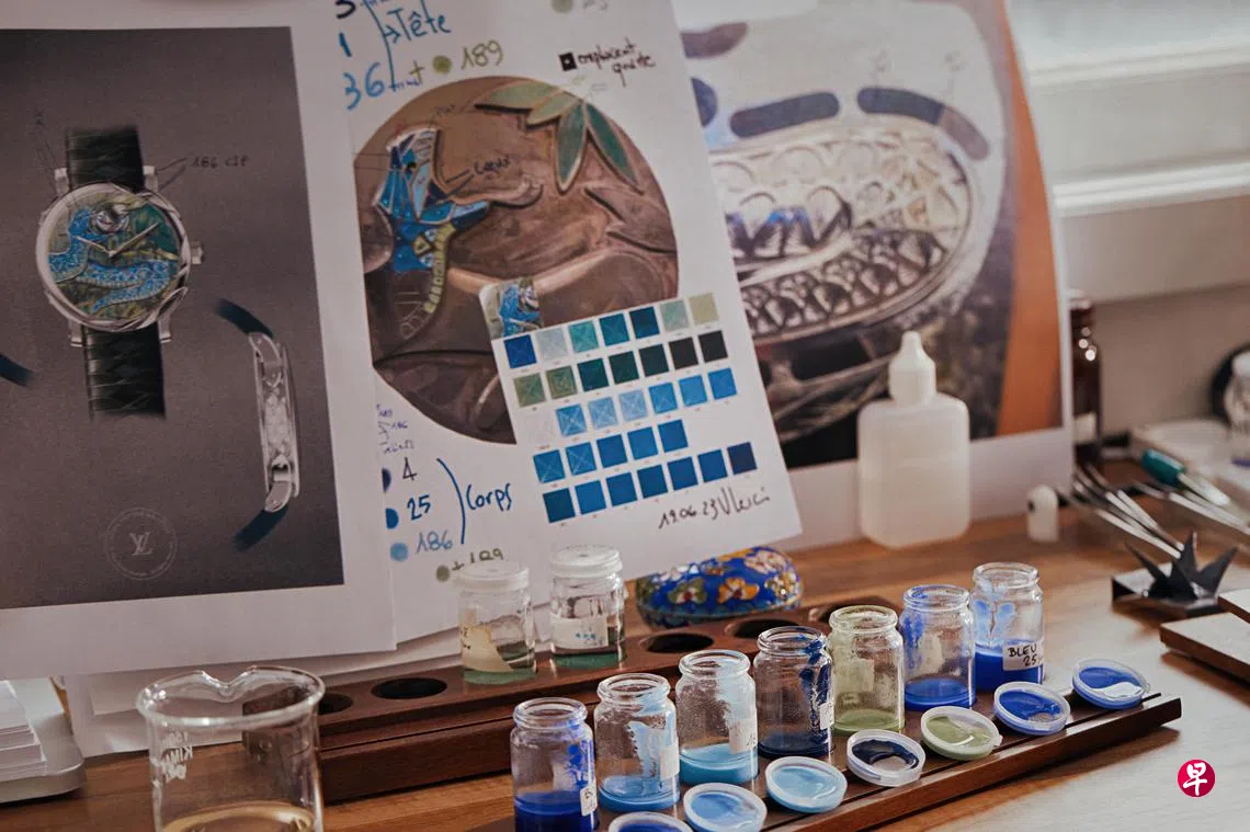 珐琅表盘的挑战是要确保成品没有气泡。珐瑯师使用画笔在每一个部分上色,遵循最传统的毛细管填充作用,由于釉料非直接附著于表盘背面,而是附著于镂空的结构中,因此珐瑯师的动作必须快速而轻柔,确保釉料均匀分布,才不会产生气泡。这枚腕表搭配独特镂空机芯日内瓦印记手动上链LV104机芯,动力储备80小时。