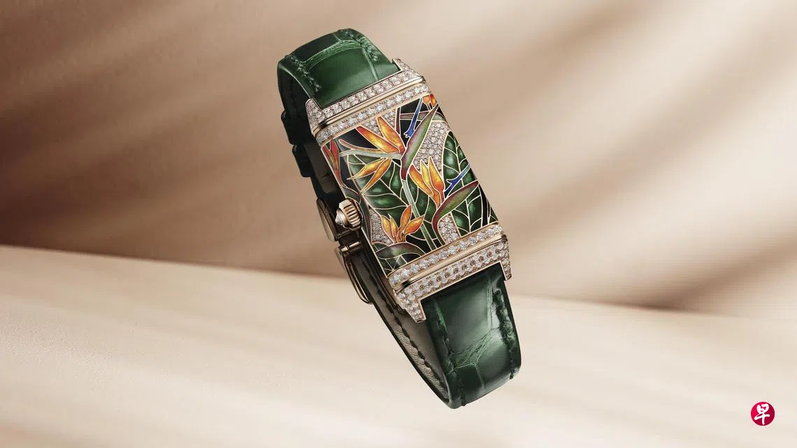 积家翻转系列(Reverso)长方形腕表有正反两面,一些款式两面都有时间表盘,另一些则将其中一面用作艺术创意画布,让积家珍稀工艺工作坊(Métiers Rares Workshop)的工艺大师施展精湛的装饰技艺与珠宝工艺。