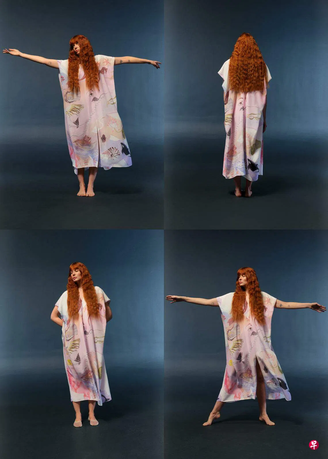 生于美国加利福尼亚的布里安娜是标准的西岸斜杠才女,曾是环保品牌Reformation的主力设计师,除了设计男女服装,还画画、做DJ。不意外,这胶囊系列里的四件宽松裙装洋溢着随心所欲的波西米亚风尚——单肩短裙,乍看像长裙洋装的无袖连身裤,V领斗篷造型长裙洋装——件件都印上她的画作,有开到荼蘼的花卉,有象征生与死的水果。穿上它们宛如把夏天穿上身。服装上周才上架,就有几款售罄。