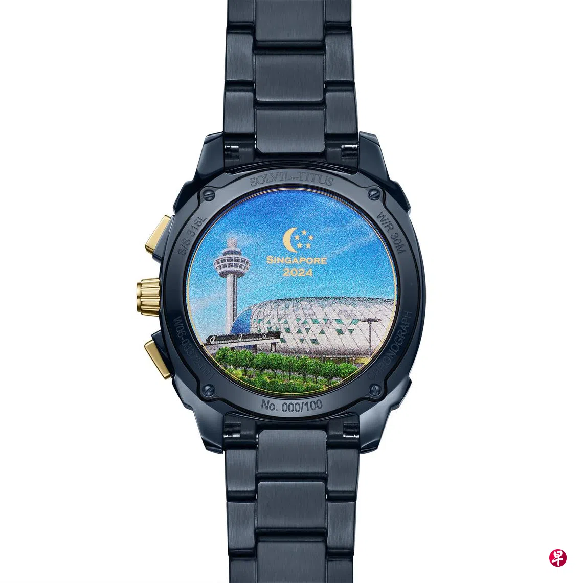 表盘左边9点钟位置的内表盘在12点钟位置印有新加坡狮头图案,表冠上有新月和星星。表背则是机场控制塔和星耀樟宜,以及“新加坡2024”和新月与五星标记。