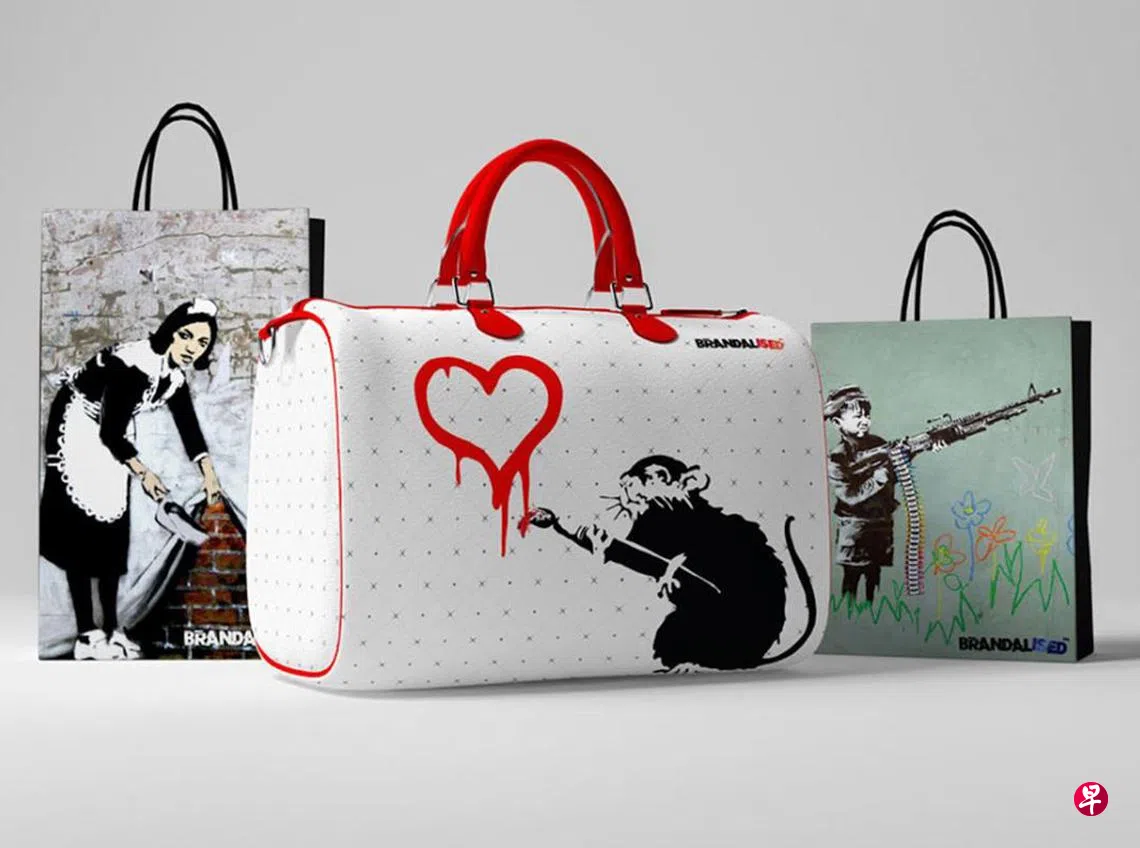 Brandalised是一家在2012年成立的涂鸦授权公司,多年来与各大品牌合作推出过多款联名系列,都是以“品牌 X Brandalised”的形式展开。譬如与日本玩具公司Medicom Toy合作推出的积木熊Bearbrick,上面印有“Loves is in the Air”、“Flying Balloon Girl”作品图案;与潮流品牌Evisu推出的街头时尚涂鸦系列,选用“Balloon Girl”“Laugh Now”“Hammer Boy”“No Parking”四幅经典作品进行二次创作。在Brandalised官网,还能看到不少潮流周边,如穿着A Bathing Ape图案外套的“Flower Thrower”摆件,以及与Salomon合作的滑板。