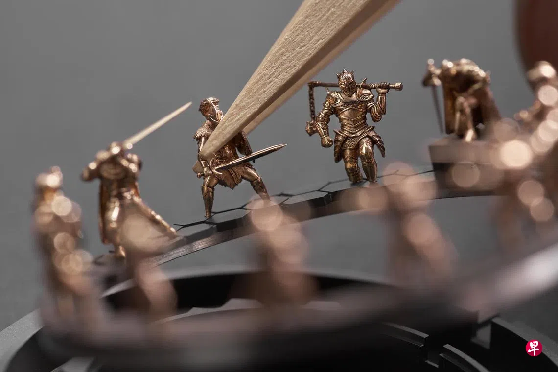 罗杰杜彼2024年的第11代圆桌骑士系列腕表整体效果几近魔幻,表盘上有12个微雕骑士,每个骑士在各自的时标上摆出充满动感、力量十足的姿势,俨然剑拔弩张、蓄势待发之态。