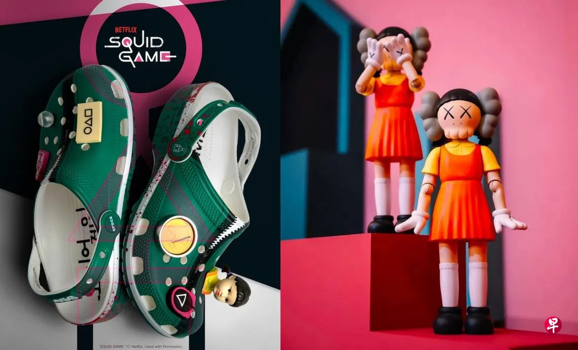 Crocs推出的联名款是在自家经典的洞洞鞋上“做文章”,以剧中参赛者的绿色运动服为灵感,在鞋身上加入标志性元素,包括人偶、椪糖、弹珠以及蒙面士兵等。