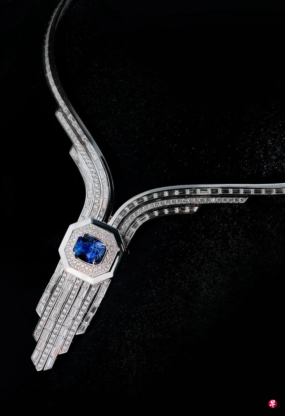 阿玛拉苏丽亚家族企业的创始人是斯里兰卡小贸易商巴拉惹(Balage Porolis de Silva)。1869年,他身带几小袋加勒(Galle)天然宝石漂洋过海来到新加坡;1872年以20元的租金在谐街(High Street)开了第一家珠宝店铺。珊雅说,选择蓝宝石来设计这项链就是因为先辈初来狮城时,口袋里装着的便是蓝宝石。钻石项链装饰艺术派的流线型设计,宛如潺潺流水,象征先辈的迁移和流动,亦是一种高贵与力量的展现。
