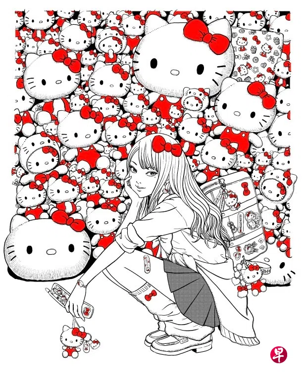 永远死不掉的富江(Tomie)是日本恐怖漫画大师伊藤润二的精心创作。这位暗黑少女美得邪恶,美得让漫画里的人物忍不住为她和对她犯罪。她像癌细胞,即使被肢解后,仍能将自己重组、复制,不断重生,将人吓得半死。近年,三丽鸥与伊藤润二协作,请出他们当家花旦吉蒂猫与富江一同“出镜”,制成各款T恤、运动夹克、别针等。