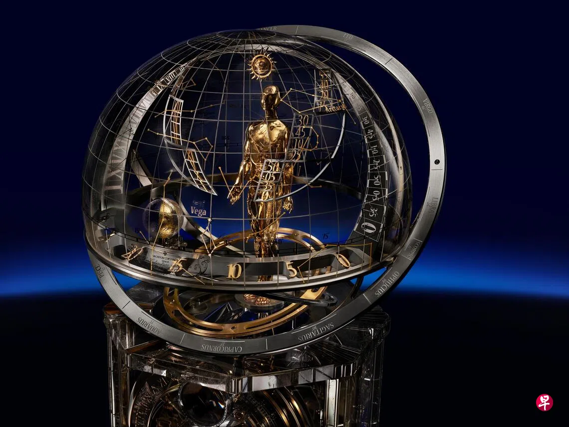 穹顶内,28厘米高的天文学家动偶伫立其中,脚下圆环象征昼夜交替,头顶玻璃罩绘满繁星。这片星空严格依据1755年9月17日江诗丹顿创立之日的日内瓦夜空重现,彼时四大行星同升,并伴随木星合日的奇观。动偶的双臂随着时光伸展,精准指示刻度。
