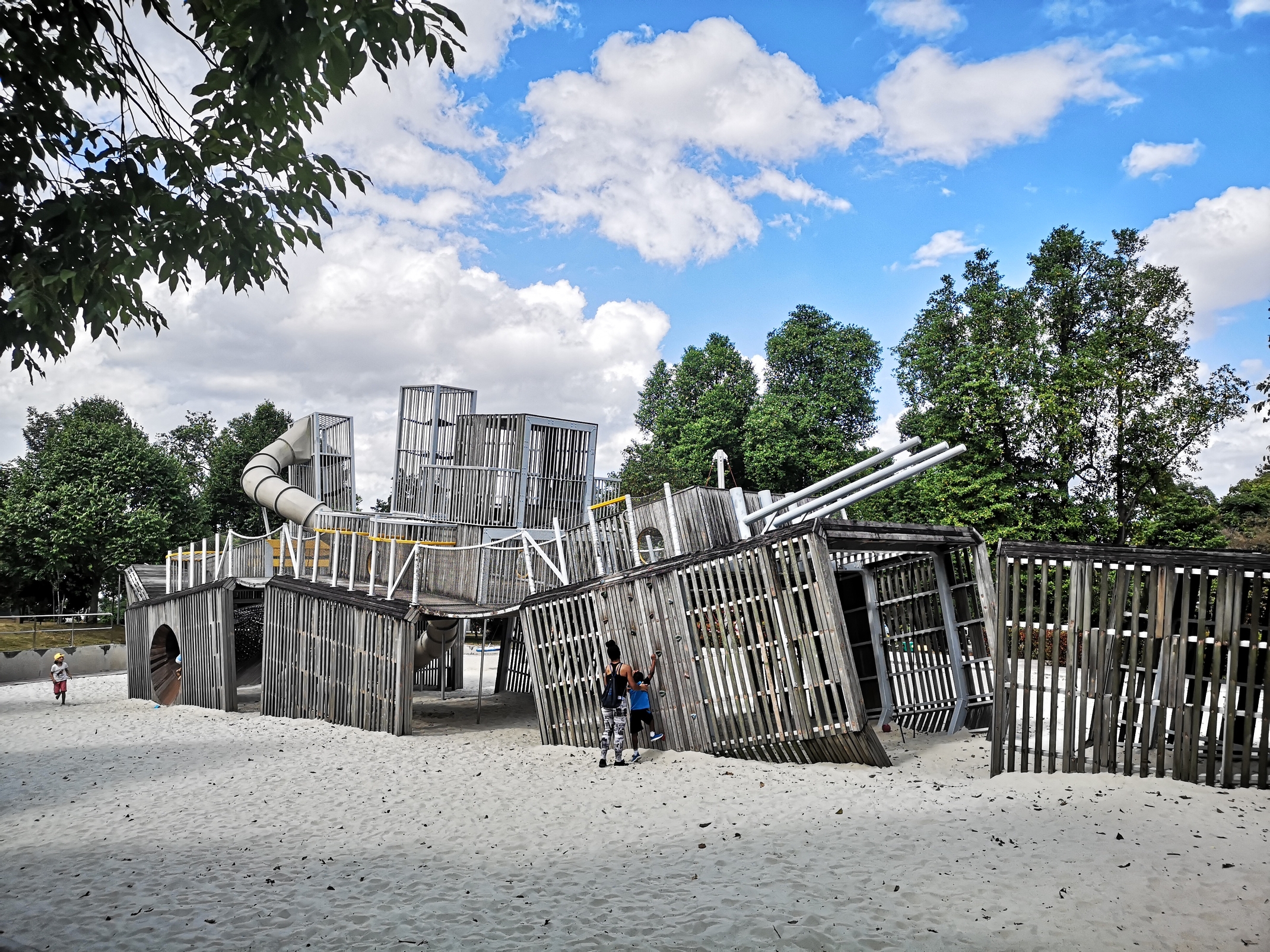 三巴旺公园除了海边就是大片的草坪与树木,地势起伏,视线开阔,中间还有一座军舰造型的沙地游乐场。公园的一边紧邻造船厂,围起篱笆,休闲自然中透着凝重森严的重工业氛围,诉说着军港的前世今生。
