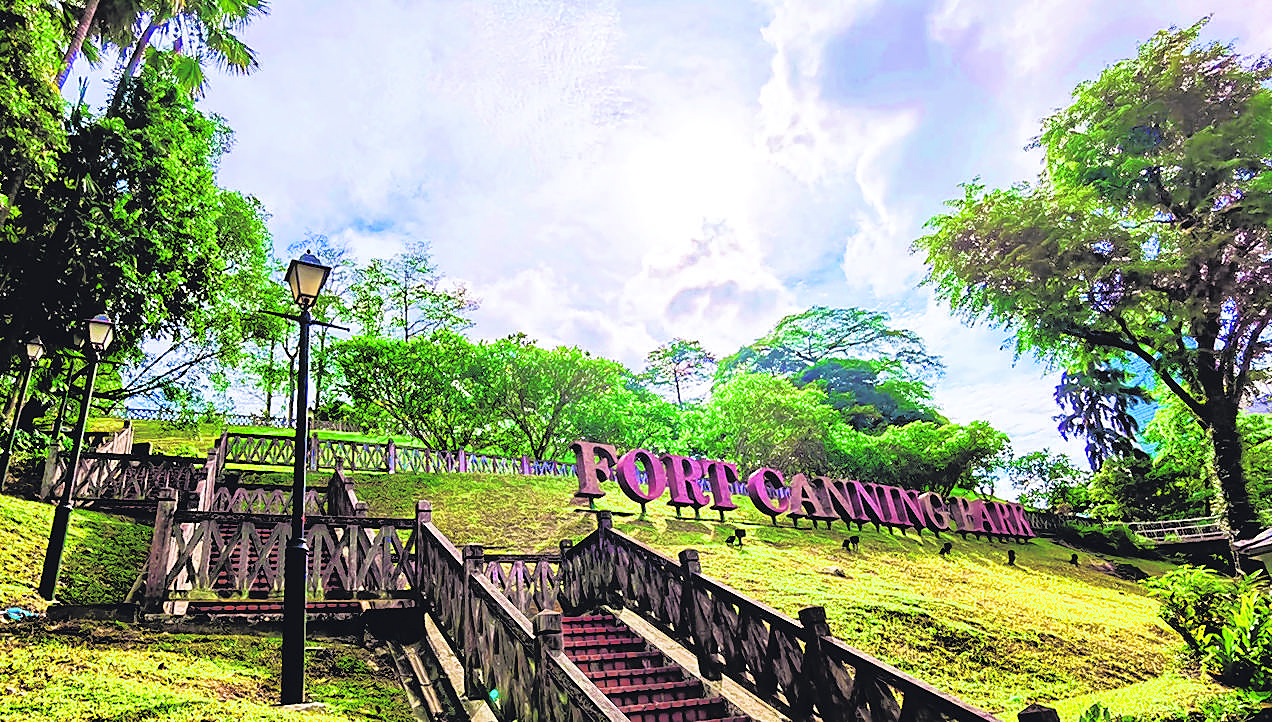 除了最大公园字样,这个入口处的石阶由红砖砌成,拾级而上,不要忘了欣赏这里的雕花木栏杆扶手。雕花花纹充满婆罗洲风格,在青葱翠绿的环境中,增添一抹古色古香的美感,同时点出岛屿700年前曾经历马来王朝的背景。