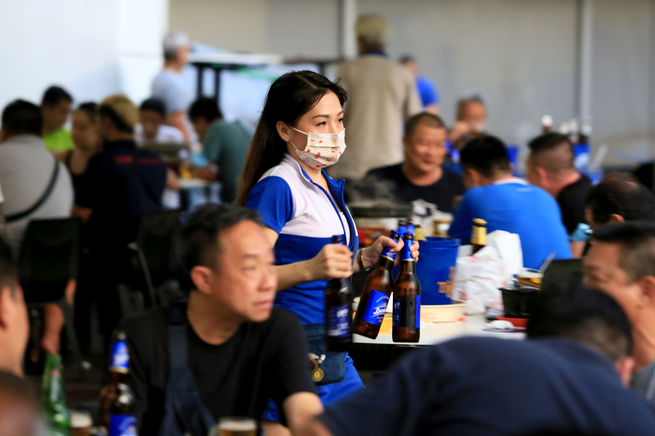 这样几次来回,访问实在难以继续,记者只好识趣地说再约。她听了立即转身,推车到后面搬啤酒放进冰柜补货,再拿出冷啤酒装桶加满冰块,然后放到几张桌子上,接着为顾客续杯,脚步一刻都没有停下。