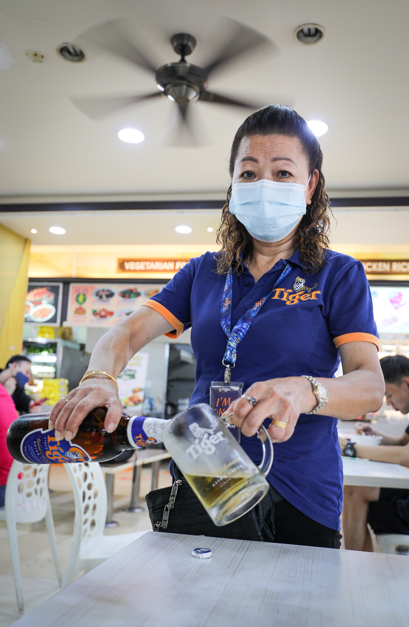 除了辛勤倒酒擦桌,白雪的嘴巴也很甜,见到熟客会直称对方“爹地”“干妈”,对其他客人也会叫声“帅哥”“美女”。必要时她会坐下来陪顾客喝两杯和聊天,她解释道:“刚开始的前三年我没有喝酒,但是后来小贩中心不可以有啤酒女郎,她们转到咖啡店来做,竞争很大。我为了多卖几瓶,顾客叫我喝啤酒,我就喝一点,但是不会喝到醉,不然怎么做工?”