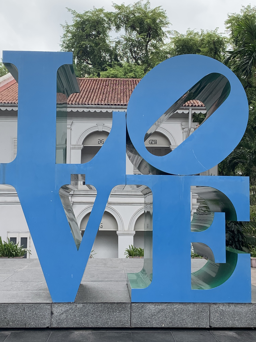 在一个不断翻新+拆除的城市,公共艺术也面临不断搬家重新落户的命运。那天意外在槟榔路温斯兰大厦2(Winsland House II)发现《爱》(LOVE)雕塑,喜出望外。这1993年安放在家居坊(Park Mall)一角的蓝绿色雕塑,可是当年的网红打卡点,情人节当天更是深受本地情侣们的欢迎,用《爱》来见证“爱”。