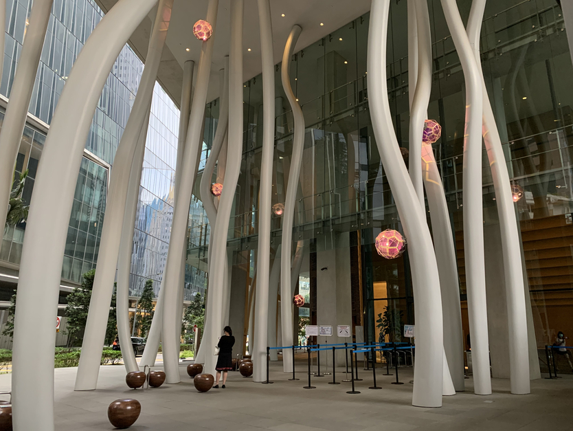 商业和艺术总是难以分割,没有富有并懂得欣赏艺术的美第奇(Medici)家族,意大利文艺复兴时期的星空也将暗淡不少。本地开发商也经常委托艺术家创作,或购买世界级的艺术作品,并布置在建筑内外提升格调。由伊东丰雄设计的CapitaGreen,就可以看到著名丹麦艺术家奥拉维尔·埃利亚松(Olafur Eliasson)的“Above below beneath above”,这名曾经把人工瀑布搬到纽约港口的艺术家,创作灵感通常取材于自然环境。56根约15米高的铁柱,宛若来自树木的气根有机生长,创作构想和环保建筑的理念一致,气根上还有玻璃球,夜晚点亮时投射出的彩影更为动人。