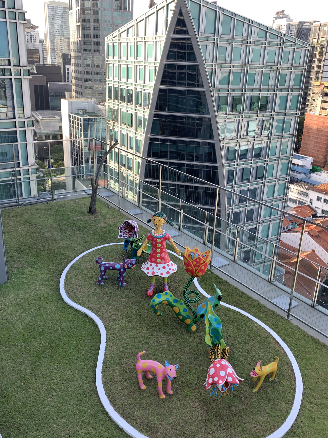 在小小的城国,就有好几处摆放了草间弥生的作品。繁华的乌节路上,中央城11楼就有个宁静的天台花园,草间弥生的波点女孩,在怪异郁金香和小狗中茫然,色彩是艳丽而明媚的,但仔细瞧或许没让人感觉欢愉。创作者写道:“在这布满了耀眼死亡和病痛的地球上,我在心碎和眼泪中度过生命,我一直在寻找郁金香的甜美,呼唤着爱的狗狗,以及无数女孩自出生就开始吟唱的歌。”作品中的女孩,就像是作者的化身,在永恒的和平中,就算一切只是源自作者的幻想,也能给她带来无以名状的欢乐。看了这幅作品,或许你更理解艺术对这艺术家的重要,已经是空气和食水,不可或缺。