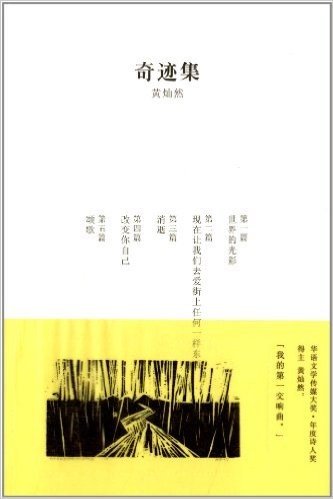 黄灿然著有诗选集《奇迹集》《游泳池畔的冥想》《我的灵魂》等。过去在香港居住的时候,他写了很多取材城市的诗歌,他初版于2012年,再版于2017年的诗选集《奇迹集》销量火红。这本诗集主要内容即书写香港的城市生活,例如这一首出自《奇迹集》的《走在下午的大街上》:走在下午的大街上/我看见一个忧伤而美丽的女孩/她的美丽吸引我,还有她的忧伤/我想跟她说说话,但我却不能!/我看见一个青年,健康而纯洁,/但黯淡的前途正烦着他,/我想叫他一声兄弟,邀他到茶餐厅/喝杯奶茶,但我却不能!/我看见一个老人,他是那样内向,/仿佛还在成长中,他显然有很多话要说——/我也有很多话要跟他说──/关于他的孤独。但我却不能!/我看见一辆电车,它正载着/失业者、求职者、离婚者、逃学者,/还有怀着一些秘密的希望的人回家,/我想坐在他们身边,但它已远去……