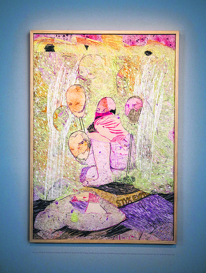 展厅正中央摆放着姬涅特手工编织的屏风,半米来高,耗时八个月完成。用一撮撮毛线钩织,色彩十分鲜艳。“原本没有想过要做屏风。”姬涅特说,创作期间遇上阻断措施,一家三口挤在家里。她要照顾女儿学习,兼顾工作,还要准备三餐。每天等女儿睡了,才把针线工具拿出来铺在地上,一点点开始钩织。
