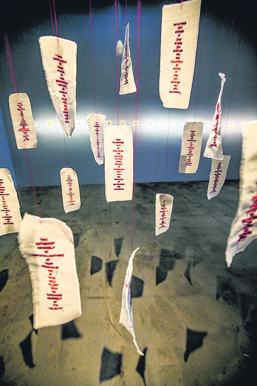 展厅的另一端悬挂着她与自己的对话,呈现形式十分有趣。她把许多灵魂拷问的话绣成符,挂起来。一行一个字,尾字母和隔行开头的首字母相连,从背后看线不曾断过,像是书法的连笔,一气呵成。句中采用第二人称,把“我”变成你,好让阅读者与句子拉开些距离。这些文字带着质问的口吻,揭示人性的脆弱,直面内心的挣扎和挑战。