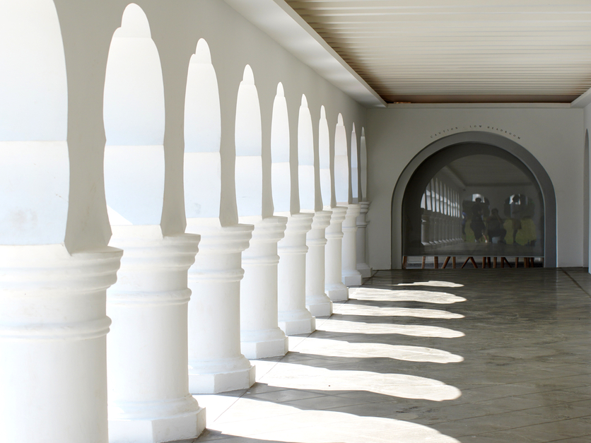 毕威尔1898年的蓝图显示最早有28个拱门,后增两个,大使馆租用期间封掉一些,仅剩18个,走在拱门下会遇到很多“死角”。团队利用蓝图3D模型,恢复了29个拱门,尽量做到访客不用频频弯腰穿过。由洋葱状蝴蝶结点缀的楼梯柱后来才出现。