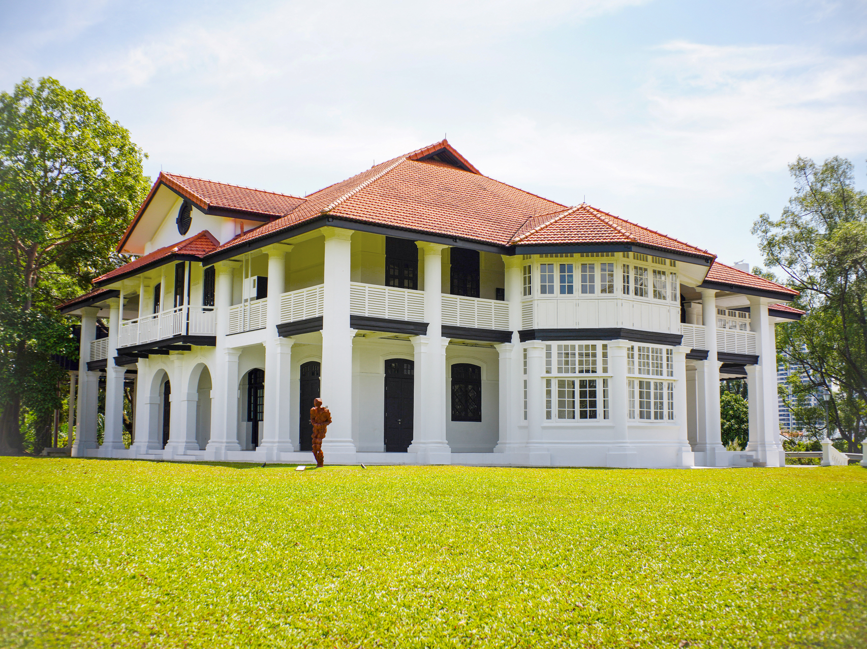 洋房建筑分上下层,上层仿都铎式,由半木与刷漆的砖墙结合,是庄园式建筑特色;下层则是印度尼西亚和马来西亚的浮脚楼,拱门采歌德式与摩尔式风格,包括五叶形(cinquefoil)设计。陈家毅说,这些拱门成为画框(房子的玻璃窗也一样),我们看得到阳光与绿地,周围的大自然,这也是一种轴线设计,在暗处望向光明。