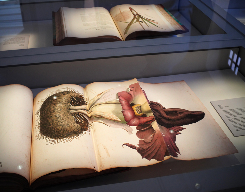 罗达透露,植物园珍藏的最古老植物书籍出版于约1500年,但该小书没插图,就没展出。这次展出附插图的最古老书籍出版于近400年前,德国植物学家格奥尔格·艾伯赫·郎弗安斯(Georg Eberhard Rumphius)的《安汶岛植物》(Herbarium Amboinense)。当时他受雇于荷兰东印度公司,收集在印度尼西亚东部发现的各种植物的用途,作为药用或建筑、纺织等素材,绘图记录。这类古书大多以拉丁和荷兰文撰写,大尺寸的版本属于奢华级别,黑白印刷的插图风格大不同,手绘上色。