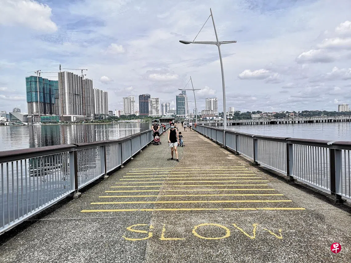 公园正对着柔佛海峡,滨海步道绵延1.5公里,完全面向着对岸风光。核心看点是一个L型码头,向海面长长延伸。400米的码头是本地最长码头,也是新加坡与新山最近的距离。偏远角落疫情期间爆红,成为分隔新马两地亲友隔海相望的最新热点。