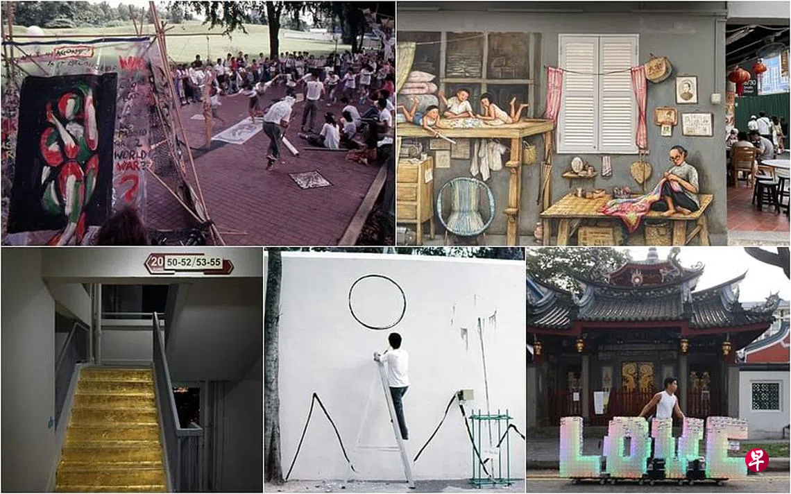 在马路上喷写“我阿公的路”,在组屋楼梯黏上金箔,是艺术创作,还是破坏公物?答案见仁见智。半个世纪以来,本地艺术工作者争取在公共空间创作,最早允许在其花园墙上涂鸦作画的电力站,是孕育本地公共艺术的摇篮之一。经过与官方多年的拔河,公共艺术创作近年慢慢受到认可。也有像装置艺术家李伟烈那样,选择不留痕的创作方式,巧妙地避过了地雷。