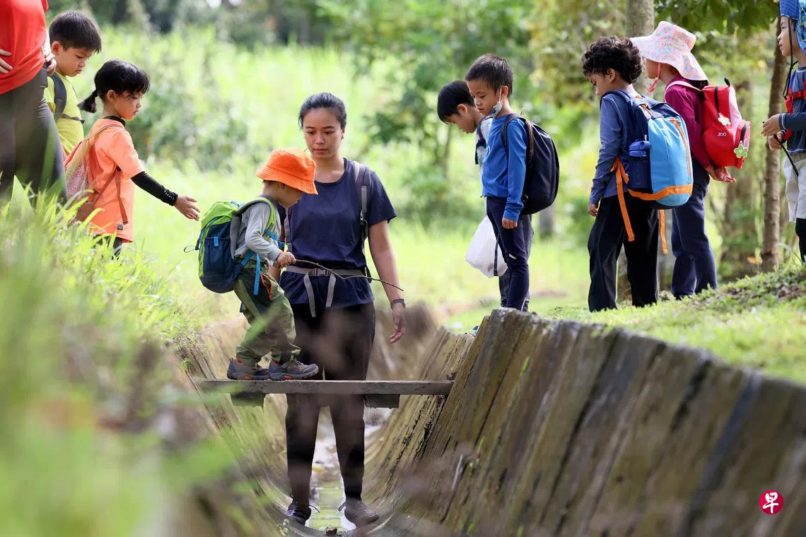 每周五早晨,无论晴天或下雨,爸妈会送6岁的雅菲亚(Afiya)和弟弟到花柏山脚下。Nature Explorers School创办人王启兴(41岁)带着两名教练,在山脚下等候,七八个学生集合完毕做好安全解说后,一行人向树林进发。最近阴雨不断,草地很是泥泞,一脚下去泥水乱飞,难免弄脏裤脚,但孩子们对此早已见怪不怪,人人“全副武装”,穿着球鞋、长衣长裤,身上还有防蚊贴。遇到需要攀爬的陡坡,成年人都要费一番力气,一个踉跄很容易摔倒,只见孩子们却踏着稳健步伐如履平地般在森林里穿梭。来到半山腰的基地,有人开始玩泥巴,有些手脚并用敏捷地爬上树。雅菲亚心血来潮想要荡秋千,教练挂了一根绳子在树上,她找来一块木板,在两头绑好绳结,简易秋千就做好了。