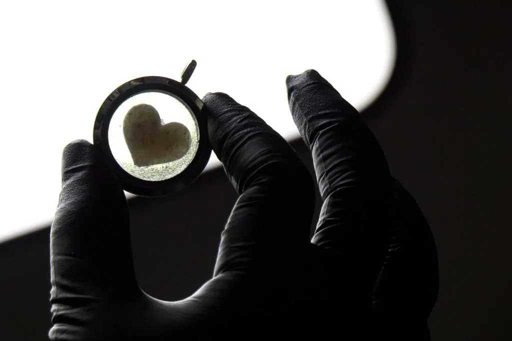 随着人们跨越对死亡的禁忌,逐渐有人将已逝世家人或宠物的骨灰或毛发制成首饰,将他或它挂在心上,戴在手上,时刻与他或它在一起。