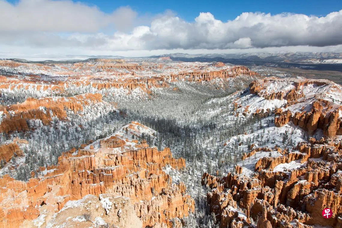 经历了一夜的寒风细雨,第二天终于看到早晨的太阳缓缓升起。我扫了手机上有关附近景点的天气新闻,看到一则新闻说布莱斯峡谷国家公园因为这场风雪,一夜入冬,整个山区都被白雪覆盖着。我感到十分兴奋,马上把行李收拾好,驱车前往150英里外的布莱斯峡谷国家公园(Bryce Canyon National Park)。